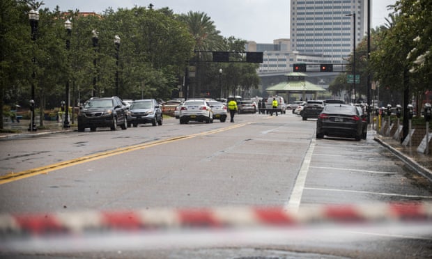 | Police barricading a street near the Jacksonville Landing area, where the shooting took place. From The Guardian. |